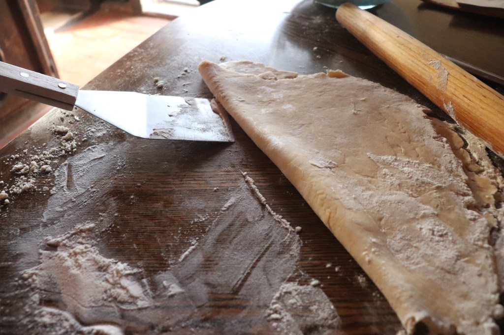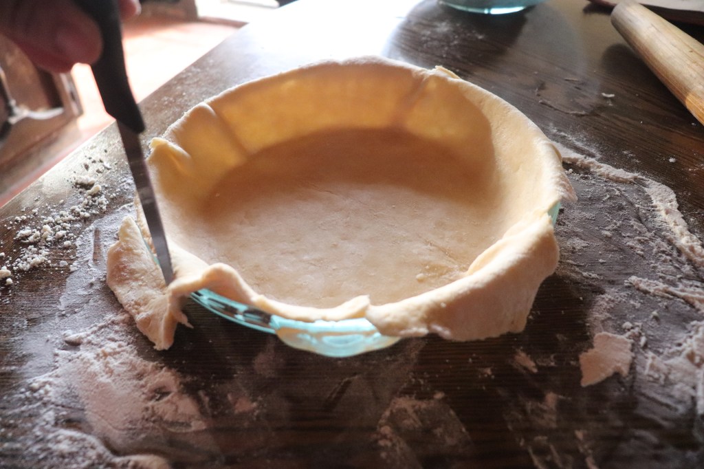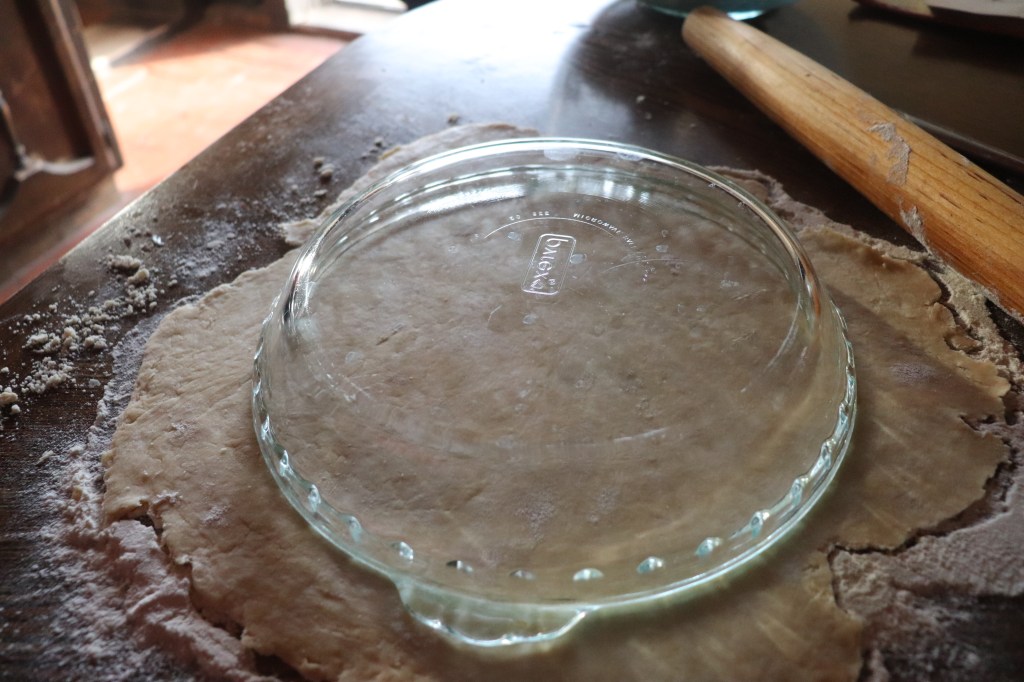 As I was saying, round it out and roll it out. Use your pie pan to make sure it’s big enough all the way around, allowing for the depth of the dish.